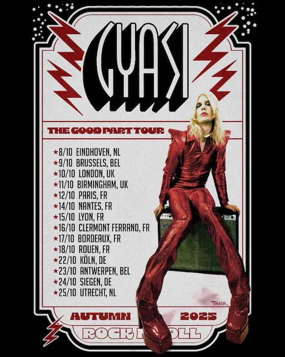 Inspiré par un large éventail d’arts et de cultures, passés et présents, son travail est nourri par une passion indéniable pour créer une musique qui propulse le rock’n’roll dans le XXIe siècle. Chaque spectacle est une performance intense et imprévisible, avec une théâtralité qui personnifie chaque chanson, portée par sa personnalité magnétique. de la rock star scintillante. Avec des riffs tonitruants, un jeu de guitare magistral et des chansons qui célèbrent l’épanouissement personnel, avec des influences de Lou Reed et David Bowie, Gyasi s’approprie l’essence du rock’n’roll théâtral et lui insuffle une nouvelle voix. Gyasi est un artiste rock moderne à nul autre pareil.