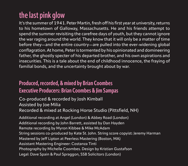« The Last Pink Glow » est une interprétation audacieuse et cinématographique du roman inachevé de Jack Kerouac, La Vie Hantée. En étroite collaboration avec Jim Sampas, exécuteur testamentaire de la succession de Jack Kerouac, le groupe donne vie à l’histoire du passage à l’âge adulte de l’auteur en musique, mettant souvent en musique les propres mots de Kerouac. L’album se déroule à Lowell, dans le Massachusetts, durant l’été 1941. Il suit l’étudiant Peter Martin, sa famille et ses amis aux prises avec les bouleversements sociaux, politiques et personnels d’un monde au bord de la guerre.