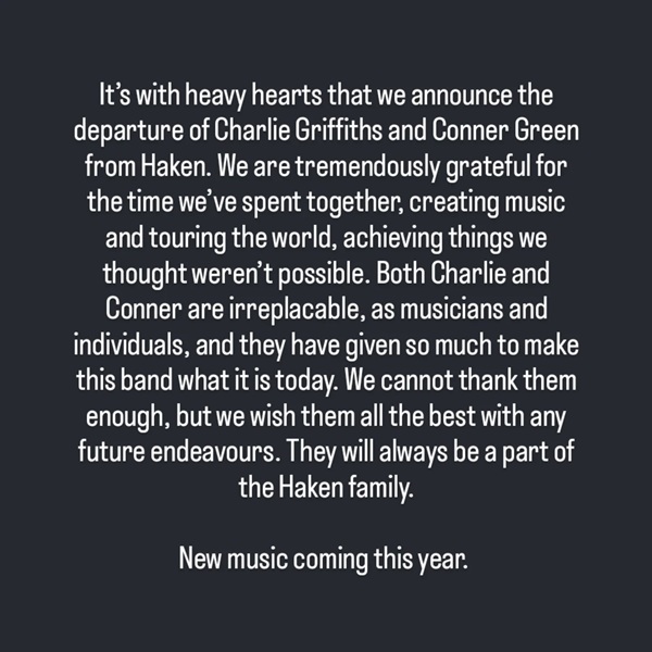« C’est avec une profonde tristesse que nous annonçons le départ de Charlie Griffiths et Conner Green de Haken. Nous sommes immensément reconnaissants du temps passé ensemble à créer de la musique et à parcourir le monde, réalisant des choses que nous pensions impossibles. Charlie et Conner sont irremplaçables, tant comme musiciens que comme personnes, et ils ont énormément contribué à faire de ce groupe ce qu’il est aujourd’hui. Nous ne les remercierons jamais assez et leur souhaitons le meilleur pour l’avenir. Ils feront toujours partie de la famille Haken. De la nouvelle musique arrive cette année. »