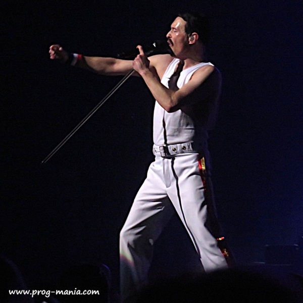 Gary Mullen possède un timbre de voix qui est très proche de celui de Freddy Mercury, et il bénéficie de très belles capacités vocales. Il maitrise parfaitement la gestuelle de l’icône britannique, que ce soit en jouant avec le manche du micro, en faisant des petits pas glissés, en se déplaçant et en courant sur la scène… Il est également en permanence en interaction avec le public : en l’invitant à chanter (… hé ho…), en checkant dans les mains des spectateurs du 1er rang, en prenant le portable d’un spectateur pour filmer la scène, en jouant avec le public, en lui parlant en anglais, en français… De plus il s’est attaché à être le sosie physique de Freddy Mercury : moustache, costumes, blouson en cuir, chant torse nu sur plusieurs titres, et il faut bien avouer que c’est plutôt réussi !…