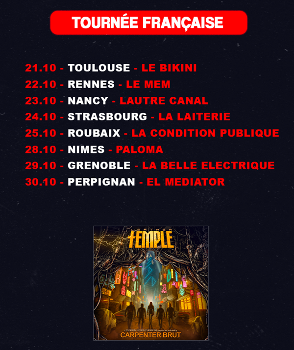 Le nouvel album de CARPENTER BRUT, Leather Temple, sortira le 27 février 2026 via Virgin Records. Il conclura la trilogie qui a débuté avec Leather Teeth en 2018, et qui s’est poursuivie avec Leather Terror en 2022.