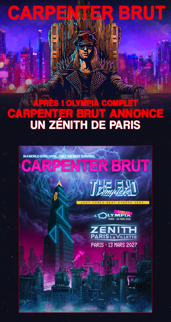 Synthwave/Métal : CARPENTER BRUT annonce de nouvelles dates de concert en France en octobre 2026, ainsi que le 13 mars 2027 au Zénith de Paris.