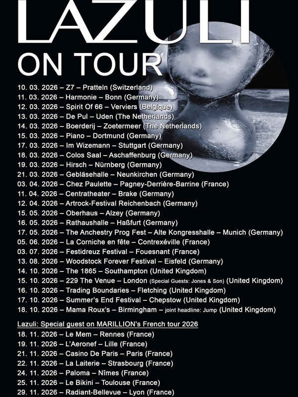 - LAZULI assurera également la première partie des sept concerts de MARILLION programmés en France en novembre 2026, ainsi que pour celui de Monte Carlo.