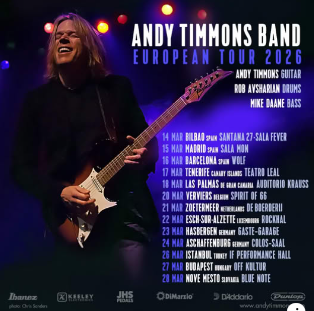 Le guitariste de rock/fusion/blues Andy Timmons sera en tournée en Europe pour une série de 13 concerts à partir du 14 mars 2026.